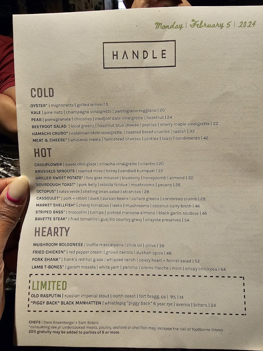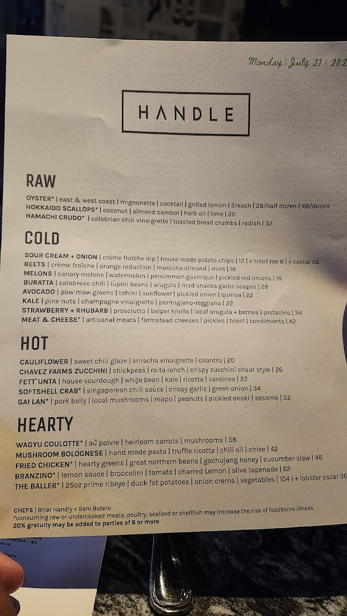 Handle's culinary creations will tantalize your taste buds and appeal to your senses. Begin your meal with the vibrant Bok Choy with Pork Belly, a dish that artfully combines the richness of tender pork belly with the crunch of sautéed greens, layered with pickled enoki mushrooms that add a refreshing burst. For an exquisite starter, don't miss the Hamachi Crudo; its delicate texture paired with zesty accompaniments creates a balanced flavor experience that sets the tone for the rest of your meal.